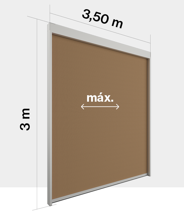 La robustez del sistema permite cubrir amplias superficies sin renunciar al diseño, con dimensiones máximas de hasta 3,50 m de ancho x 3 m de alto, en función del tejido.